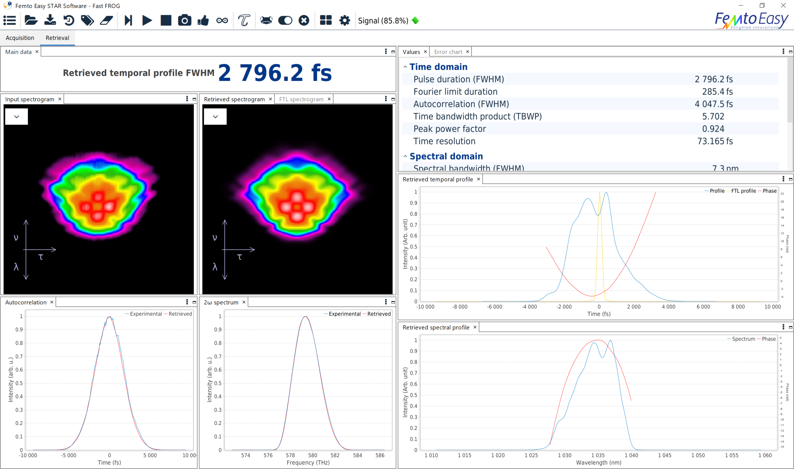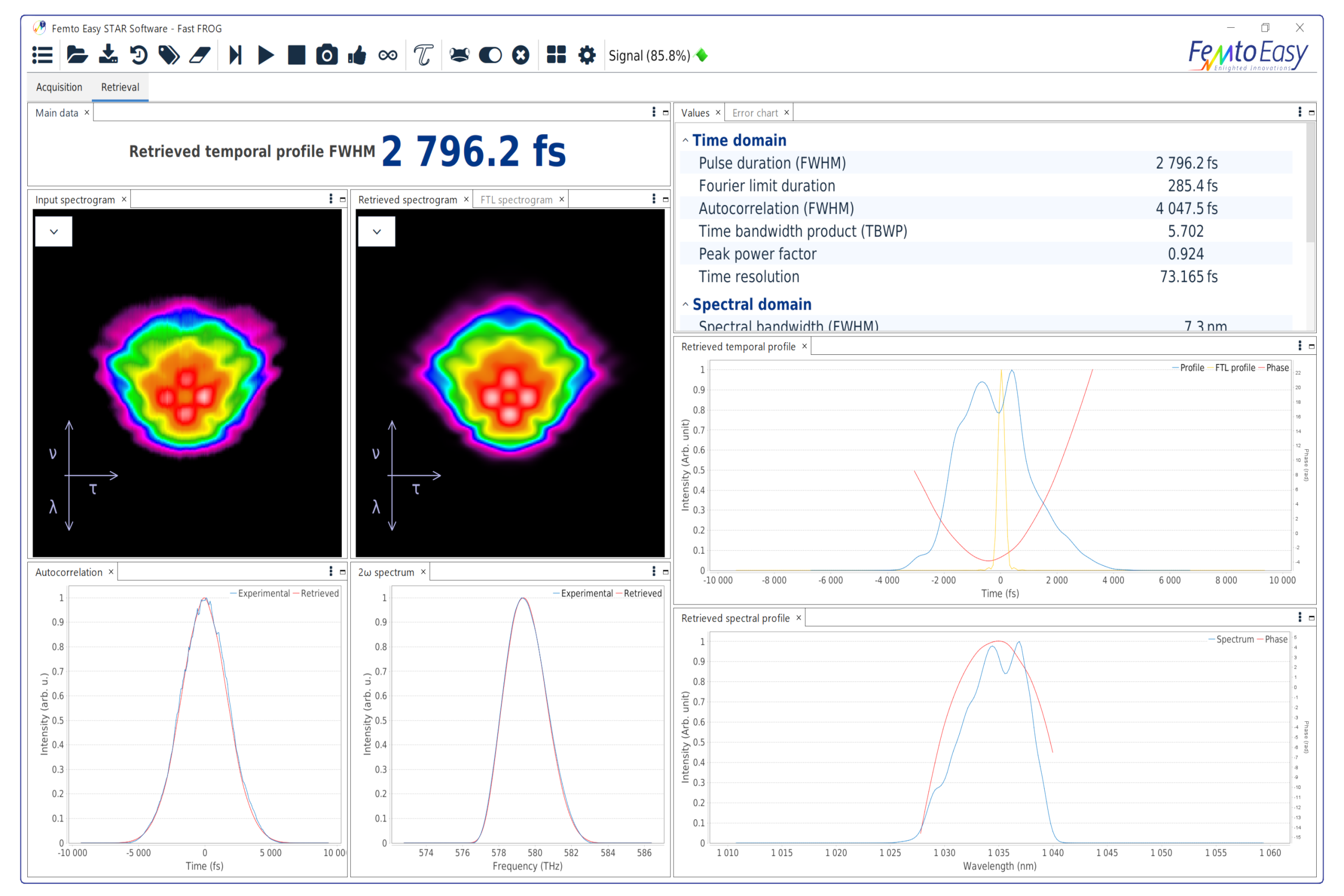 Thanks to speed, the live extraction of shot-to-shot pulse properties are achieved, such as temporal profile intensity and phase, fundamental spectrum and phase, pulse chirp, third-order dispersion, and, of course, pulse duration (FWHM, autocorrelation FWHM, Fourier-limited pulse duration).